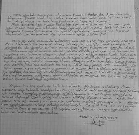 Kubbe-i Hadrâ’nın 1949 yılı onarımında kubbeye kaplanan çiniler 2 yıl içinde dökülmüş ve bu durum birçok tenkide yol açmıştır. Bazı yayınlarda bu çinilerin Kütahya’da Azim Çini Fabrikası[19] tarafından bazılarında ise Metin Çini Fabrikası tarafından imal edildiği belirtilmektedir[20]. Ancak yapılan araştırmalar bu çinilerin, Kütahya’da Mehmet Üstünkaya’nın sahibi olduğu Öz Çini Fabrikası tarafından imal edildiğini ortaya koymuştur. Konuyla ilgili olarak Öz Çini fabrikasının sahibi Mehmet Üstünkaya’nın oğlu Hamza Üstünkaya ile de görüşülmüş ve söz konusu hadiseyi el yazısı ile anlatımı G. 4’te verilmiştir. Kültür Bakanlığı sanatçısı ve aynı zamanda UNESCO tarafından Yaşayan İnsan Hazinesi olarak kabul edilen Hamza Üstünkaya göndermiş olduğu beyanatında özetle: