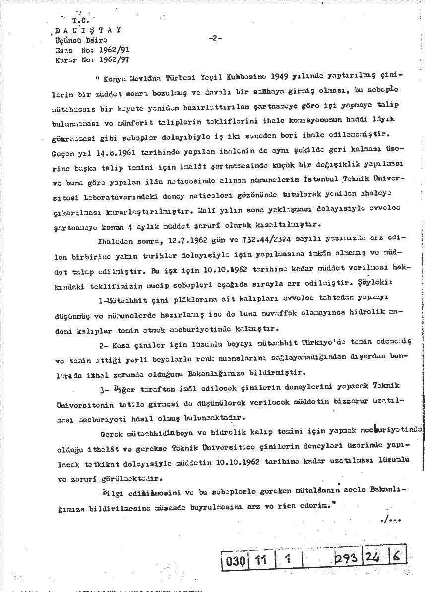 Öte yandan Konya Şehir Postası gazetesinin manşetten verilen 17 Mayıs 1963 tarihli haberinde Mevlânâ Türbesi çinilerinin 1963 yılında yenileneceğinin yazması çinilerin üretilme safhasında olduğunu göstermektedir. Ayrıca Konya Işık gazetesinin 20 Aralık 1961 yılı haberinde Kubbe-i Hadrâ’ya kaplanacak çinilerin İstanbul’da üretileceği ve firmanın çinilere en az 40-50 yıl dayanma garantisi verdiği bildirilmektedir[31]. Bu tarihlerde çini imali Taylan Seramik Fabrikası’nın sorumluluğundadır. Taylan Seramik Fabrikası İstanbul ve Samsun’da seramik üretimi gerçekleştiren, modern büyük elektrikli fırın ve diğer teknolojik imkânlara sahip, Almanya ve İtalya ile kuvvetli ticari bağlantıları olan ve ithal renkli sırlar kullanan bir fabrikadır. Buna rağmen Kubbe-i Hadrâ çinilerinin imalinde hidrolik madeni kalıplar temin edememiş, çinilerde lüzumlu boyayı Türkiye’de bulamamış ve dolayısıyla boyaları yurtdışından ithal etmek zorunda kalarak çini imali için ek süre istemiştir (G. 8).