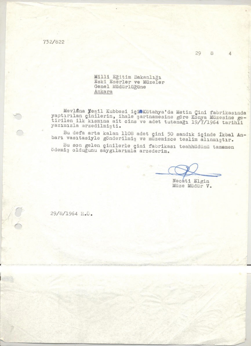 Konya Müze Müdürlüğünden temin edilen belgede (G. 10) 1965 onarımında kullanılan çinilerin Metin Çini Fabrikası tarafından 19.07.1964 tarihinde müzeye teslim edildiği bildirilmektedir. Buradan Taylan Seramik Fabrikası’nın iflası sonrası çini üretim işinin Metin Çini Fabrikasına verildiği anlaşılmaktadır. Ancak 1960’lı yılların Kütahya’sının kısa sürede teknolojik açıdan oldukça kaliteli çinileri imal etmesi bazı soru işaretlerinin oluşmasına sebep olmuştur. Çünkü Kütahya çiniciliğinde hidrolik pres ve çelik kalıp kullanımı 1960’lı yılların sonlarında, elektrikli fırın kullanımı ise 1979 yılından sonra başlamıştır. Her ne kadar Kütahya’ya ilk elektrikli fırın 1962’de Ahmet Gürel tarafından Almanya’dan getirtilmiş olsa da bu fırınlar sık yaşanan elektrik kesintilerinden dolayı ancak seramikte sır üstü ve altın yaldız teknikleri gibi kısa pişirimlerde kullanılabilmiştir[25]. Bu sebeple çinileri Metin Çini Fabrikası tarafından imal edilmesi pek olası görünmemektedir. Konu daha detaylı incelendiğinde bu fikri kuvvetlendiren önemli bilgiler elde edilmiş ve bu bilgiler maddeler hâlinde aşağıda sunulmuştur.